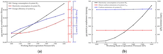 The effect of evaporation pressure of working fluid on system performance. (a): System energy consumption and exergy efficiency; (b): System electricity consumption and carbon emissions.