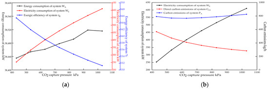 The effect of CO2 capture pressure on system performance. (a): System energy consumption and exergy efficiency; (b): System electricity consumption and carbon emissions.