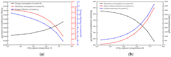 The CO2 capture temperature influences the SCV flue gas CC amount, the system energy consumption, and the system exergy efficiency, and the effects on the system performance are shown in Figure 9. The system energy consumption increased, the electricity consumption and exergy efficiency of the system decreased, and the CC amount of the system greatly reduced as the CO2 capture temperature increased, so the direct carbon emission of the system increased significantly. Even when the electricity consumption of the system was reduced, the carbon emissions of the system still increased significantly. The CO2 capture temperature increased, the cold energy needed by the heat exchanger H-3 decreased, and the LNG temperature at the SCV inlet decreased, thus increasing SCV fuel gas consumption. In addition, the inlet temperature of turbine E-3 increased, and its net work increased. Equation (10) can explain that the decrease in system exergy efficiency was due to the reduction in the CC amount of the system.