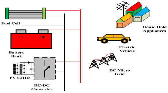 The advancement in the field of renewable energy sources and the development of power electronic converters have been constantly increasing over the past decade. DC–DC converters have numerous applications, including solar photovoltaic applications, battery chargers, medical instruments, high-voltage DC systems, electrical vehicles, and many others [1,2,3,4,5]. As we all know that the output of solar PV converters varies widely, for maintaining the constant output voltage under varying insolation and load conditions high-performance DC–DC converters play a very important role. High-gain power converters are also used in HVDC transmission lines [6,7]. Some of the applications of the DC–DC converter are presented in Figure 1. There are several significant technical advantages and areas of application of these converters. They have a simple structure, a wide range of input/output voltage, high efficiency, and acceptable power density. They also have some disadvantages such as a higher number of switches, and high switching frequency due to which electromagnetic interference occurs. They are costly, a complex control system is required, and they are difficult to manufacture. Buck converters are only capable of decreasing the output voltage and have a narrow duty ratio window which limits the high step-down applications. Similarly, boost converters are only capable of step-up applications and are not advisable to use at a very high duty ratio. The effect of non-idealities is dominant at high duty ratios, and the output voltage of the converter begins to decrease after a certain value of high duty ratio [8].
