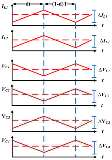 The selection of the capacitors could be carried out based on the permissible ripple in the voltage across them as well as the magnitude of the voltage across the capacitor. Therefore, the selection of a capacitor should be carried out by considering a range of the duty ratio so that the selected capacitor does not burst, that is, the voltage rating of the capacitor should be high enough to support the maximum voltage across it. The value of the capacitance of each capacitor could be calculated as follows: