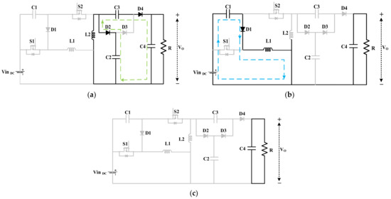 Before completing the second mode of operation as described in the previous section, the converter switches to discontinuous conduction mode when either all or any of the inductor currents reach zero. There are two inductors in the proposed converter, therefore there are three possible conditions of discontinuity. For each condition, there are equivalent circuits which are presented in Figure 6.