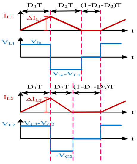 For the continuous conduction mode of operation, the current in both inductors must be continuous. Figure 3 displays the current waveforms for the inductors and the voltage waveforms for the capacitors for the continuous mode of conduction. Based on switching signals, there are two modes of operation. The first is the switch ON mode of operation, and the second is the switch OFF mode of operation. Since both switches (S1 and S2) are operated simultaneously, they both are turned ON and OFF at the same time. Therefore, both switches require the same switching signal to operate.