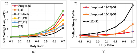 Comparison with other converters: (a) voltage gain, (b) switch voltage stress.