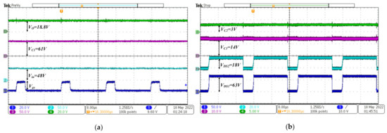 The various measured waveforms for the duty ratio of 0.4 are shown in Figure 11. The measured output voltage is 75.7 V and the voltage stress is 74 V and 53 V, respectively, for the switches S1 and S2. The test results at a duty ratio of 0.6 are shown in Figure 12. The measured output voltage is 284 V which is 4 V less than the calculated value. The results are summarized in Table 3.