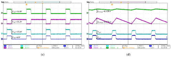 A 300 W hardware prototype is developed and put to the test to evaluate the efficiency of the proposed converter (see Figure 9). Table 2 contains the design specifications and components. The calculated value of capacitances is the minimum value required for maintaining the ripple below the desired value. The higher values of the capacitances are taken in our prototype just to ensure that the ripple is reduced further. We need to consider the voltage rating of the capacitor as well to prevent the breakdown of the capacitor, so a higher voltage rating is selected for C2 and C3 as compared to C1. To test the developed hardware prototype, a pwm pulse of the required duty ratio is generated by using microcontroller STM32, Nucleo H743ZI2 and targeted to the gate driver circuit. An extra power DC power source with two isolated voltage regulator ICs (MCWI03-48S15) is used to run both switches. The duty ratio is set at 0.2 with a frequency of 50 kHz and a load resistance of 150 ohms to examine the buck mode of operation. The measured waveforms are shown in Figure 10, and the output voltage is 18.8 V as shown in Figure 10a, which is slightly higher than the theoretical voltage of 18 V. Figure 10b shows the measured test results for the voltage stress across the power switches, and the measured and the calculated voltage stress across the switches are almost equal. Due to the low output power and large ripple in the inductor current IL1, the inductor is working in boundary conditions as presented in Figure 10d, and if the duty ratio is reduced further the converter would possibly come to DCM. The duty ratio is set to 0.4 and 0.6 for the boost mode of operation, with a fixed load resistance of 300 ohms.