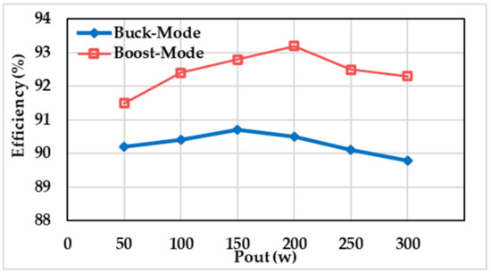 The measured efficiency of the proposed converter is presented in Figure 13. The boost mode of operation has a maximum efficiency of 93.2%, while the buck mode of operation provides a minimum efficiency of 89.8%.