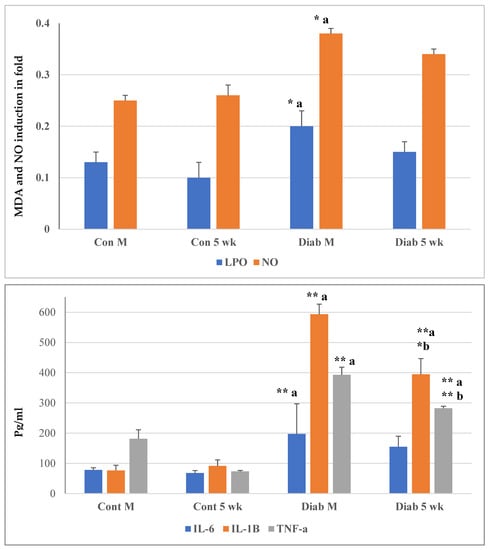 Untreated diabetes induces oxidative stress and inflammation in mothers and inflammatory response in 5-week-old offspring. (A). Lipid peroxidation products, MDA and NO induction in control and diabetic mothers and their offspring. (B). Untreated diabetes during pregnancy affects the proinflammatory cytokines level in serum of mothers and offspring. p ≤ 0.05 * significant variation, p ≤ 0.01 ** high significant variation. a versus appropriate control; (control mothers, Con M and 5-week-old offspring, con 5 wk), b relative to diabetic mothers (Diab M, n = 4–5.)