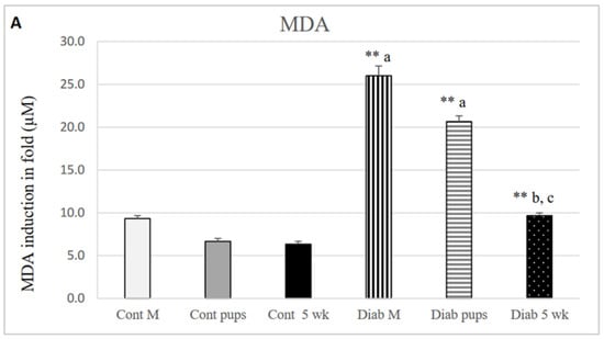 It is documented that maternal diabetes is associated with neuroanatomical deficits in developing fetuses of animal models and a higher incidence of psychological disorders in human offspring [,]. Since the brain is comparatively in demand of high oxygen utilization, it provides a rich environment for the free radical by-products; in addition, the antioxidants and the lipid-rich constitution are ready substrates for oxidation, which can reduce the potential of certain neurotransmitters and induce psychological disorder [,]. In this regard, we checked the lipid peroxidation products in brain tissues of diabetic mothers and their offspring relative to the control mice (Figure 2A). A significant increase in LPO was found in the brains of diabetic mothers and their newborn pups relative to control mothers and their offspring (p = 0.0002 and 0.0001, respectively). However, the 5-week-old offspring of diabetic mothers showed a significant increase of LPO products compared to the control young 5-week-old offspring, but displayed a significant decrease compared to diabetic mothers and their pups. This indicates that the brain of newborn pups is mostly affected by the stressed environment induced during pregnancy.