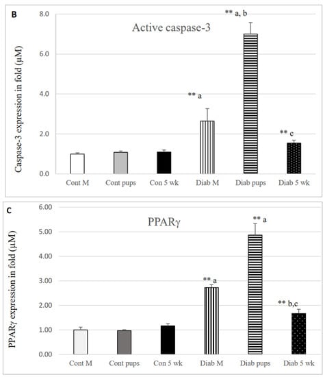 Untreated diabetes during pregnancy induces oxidative stress and increases the rate of apoptosis and the expression levels of PPARˠ in brain tissue. p ≤ 0.05 * significant variation, p ≤ 0.01 ** high significant variation. (A) versus appropriate control (mothers, newborn pups and 5-week-old offspring), (B) relative to diabetic mothers, (C) relative to diabetic pups. n = 4.