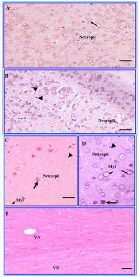 To this end, oxidative stress was observed in the blood and brain of diabetic mothers and offspring, which was associated with a higher level of proinflammatory cytokines in the blood of these mice. Therefore, we next checked the histological alterations induced in diabetic mothers and their newborn and 5-week-old offspring relative to the appropriate control mice. As shown in Figure 3 and Figure 4, the cerebral hemisphere of control mothers showed a normal appearance of neuropil, high density of neurons with light normal nuclear stain, and myelinated neurons (Figure 3A,B).