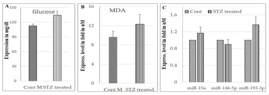 The brain is one of the main organs that are affected by hyperglycemia, and it is of the major organs that produce miRNAs; therefore, we have tested the dysregulation of miRNAs in brain tissues of the diabetic model and the control. Initially, we checked the direct toxic effect of STZ on pregnant mice several hours after STZ injection. We tested the blood glucose level in the blood of these mice 28 h after STZ injection relative to the control (Figure 5). Data showed a non-significant increase in blood glucose of STZ-treated females. In the meantime, the difference in MDA level between the control and STZ-treated mice was not significant at this time point. Then, after 28 h of STZ injection, no direct oxidative stress from STZ was observed. On the other hand, miRNAs expression levels in brain tissue of the control and STZ-treated mice (28 h after i.p. injection) showed no statistical variation between groups (Figure 5).