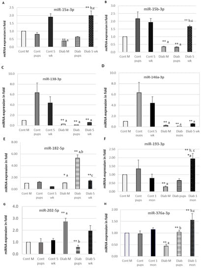 miRNAs expression in brain tissues of control and diabetic mothers and their offspring. (A–H) The expression levels of the miRNAs are shown, (A) miR-15a-3p, (B) miR-15b-3p, (C) 138-3p, (D) miR-146a-3p, (E) miR-182-5p, (F) miR-193-3p, (G) miR-202-5p and (H) miR-376a-3p. p ≤ 0.05 * significant variation, p ≤ 0.01 ** high significant variation. a, versus appropriate control (mothers, newborn pups, and 5-week-old offspring), b, relative to diabetic mothers, c, relative to diabetic pups. n = 4.