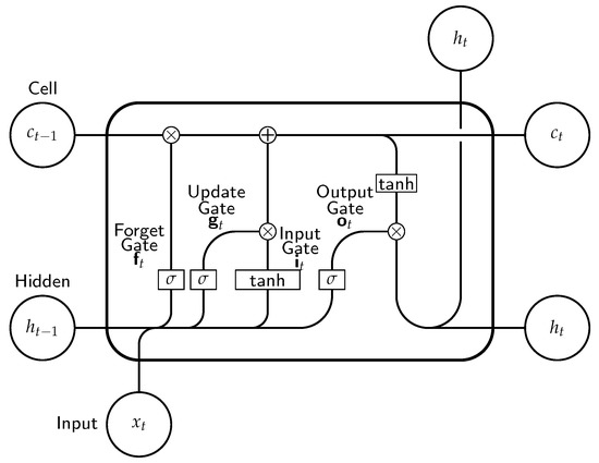 The LSTM unit is composed of three gated units and a memory cell [30]. Figure 1 shows a single LSTM unit that includes four major gates: the forget gate (), the input gate (), the output gate () and the update gate (). The key component of the LSTM unit is the memory cell () that is responsible for storing critical long-term dependencies learned over time. The input gate () is responsible for evaluating which part, if any, of the past historical data should be kept. Thus, the function of the input gate is to allow the network to keep only relevant information from the previous time steps and discard the rest for a sample i.
