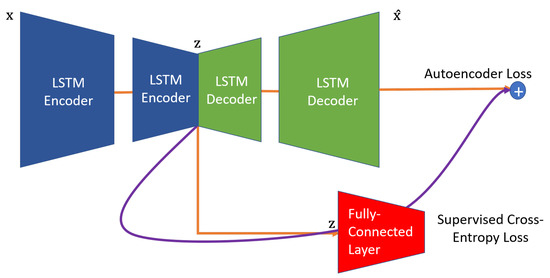 In this work, we use LSTM units instead of dense layers for both the encoder and decoder, as shown in Figure 3. The goal is to reconstruct and classify input sequences at time t simultaneously. The encoder transforms the input time sequences using Equations (1)–(3) to learn important features and encode these features . The decoder function reconstructs the input using the extracted feature vectors. The operation performed by the encoder for a single LSTM layer between the input variables to the latent variables can be mathematically described as follows: