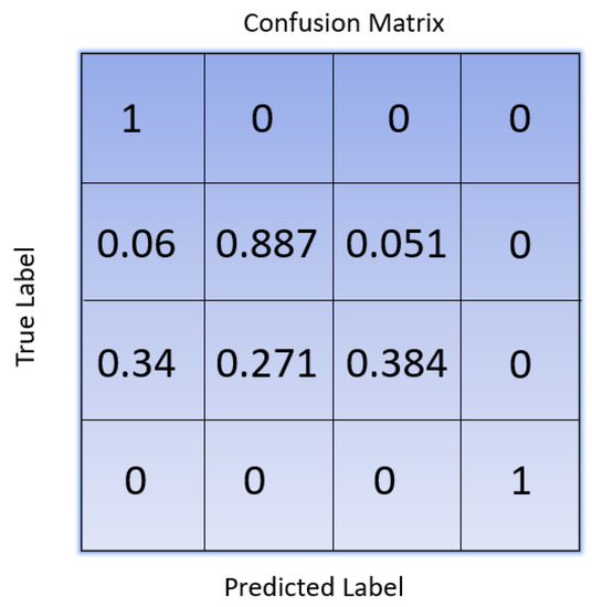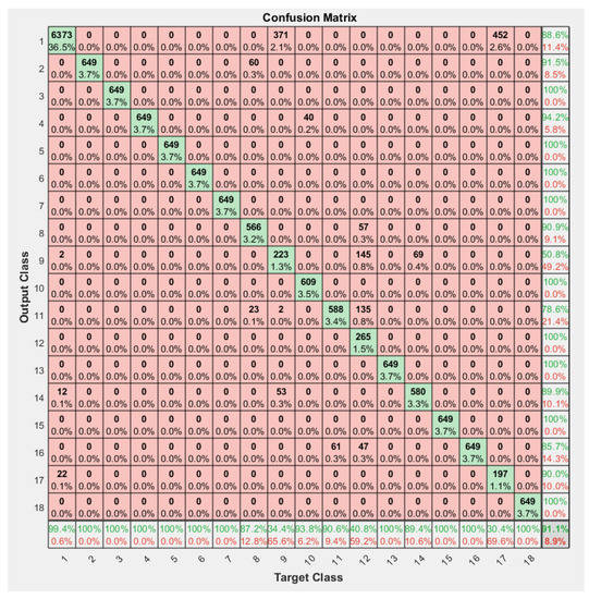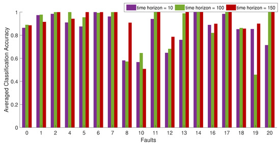 Subsequently, the faults were diagnosed using the proposed hierarchical structure where the first level model of the hierarchical structure classifies non-incipient faults and the second level model classifies incipient faults. For the first level model, there are 7382 training samples and 17,442 testing samples in total with a time horizon of 150 time-steps. The model consists of 182 encoder LSTM units, which is followed by 116 LSTM units for processing of the output of the encoding layer. Thereafter, the output of the second LSTM layer is passed through a dense layer for classification. Hyper-parameters such as number of layers, number of LSTM units in each layer, classification weights, learning rate, time-horizon etc. are selected using validation data that are part of the training dataset. The confusion matrix for level 1 model is presented in Figure 6. The hyper-parameter search is implemented using a Keras-tuner. Firstly, a grid of hyper-parameters is defined, for example the number of encoder layers = [1, 2, 3], number of LSTM units for each of these layers ranging from 2 to 200 with an interval of 2 = [10:2:200], learning rate = [0.1, 0.2, 0.3, 0.01], value of weights in the objective function, etc. Keras-tuner trains the model using different combinations of these hyper-parameters values, and the averaged validation accuracy is evaluated at every epoch. The models are trained with a few epochs at the start, and the selected models with high validation accuracy are chosen to be trained for more epochs. A study was conducted to select the optimal time horizon for the LSTM-based model. It can be seen from Figure 7 that the classification averages can be enhanced by extending the length of the time horizon of past data fed to the LSTM-based model. A total of 150 time steps were chosen as the optimal time-horizon.