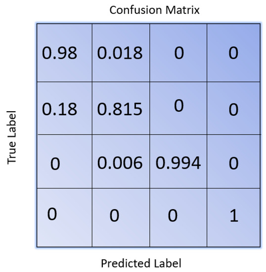For the second level model, there are 1796 training samples and 4196 testing samples in total with a time horizon of 150 time-steps. The model consists of 284 encoder LSTM units in the first hidden layer, and the second layer consists of 100 LSTM units, which is followed by 278 LSTM units for processing of the output of the encoding layer. Thereafter, the output of the third LSTM layer is passed through a dense layer for classification. Hyper-parameters such as the number of layers, number of LSTM units in each layer, classification weights, learning rate, time-horizon, weights in the loss function, etc. are selected using the validation data which is part of the training dataset. The hyper-parameter search is implemented again using the Keras-tuner. For the second level model, the samples corresponding to fault 0 (normal) and incipient faults are considered. Figure 8 shows the confusion matrix after introducing the PRBS signal that was designed for identifying fault 15 and Figure 9 shows the confusion matrix after introducing both PRBS signals that were designed for identifying fault 15 and fault 9. The total FAR calculated using Equation (16) was 2.41%.
