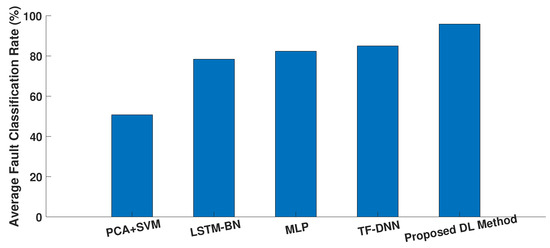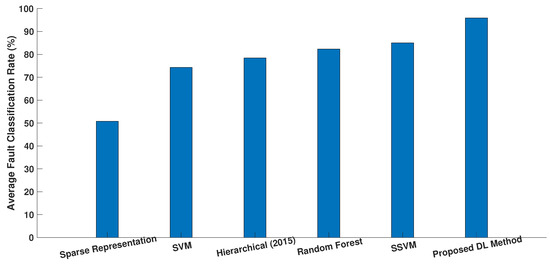 The averaged fault classification rates for all non-incipient faults and for all faults (including incipient faults) are shown in Figure 10 and Figure 11, respectively. Figure 10 shows a bar-chart comparison of the proposed method with several non-linear methods such as sparse representation [40], SVM [41], hierarchical model based method [42], Random Forest, and structural SVM. It can be seen that the hierarchical deep RNN-based method outperforms other methods with a significant margin. It should be noted that the comparisons made in Figure 10 do not consider incipient faults. In Figure 11, the averaged test accuracy of all faults (both incipient and non-incipient faults) are compared with other DL-based methods [43]. It can be seen that the second level hierarchical model combined with the introduction of the designed PRBS signals significantly improves the classification of the incipient faults, and thus, the averaged test accuracy for fault diagnosis increases significantly.