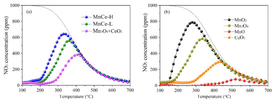 NO2 evolution during NO-TPO tests over (a) Mn0.15Ce0.85O2−δ mixed oxides and (b) reference oxide catalysts. Reaction conditions: NO = 1000 ppm, O2 = 10%, N2 in balance, GHSV = 30,000 h−1.
