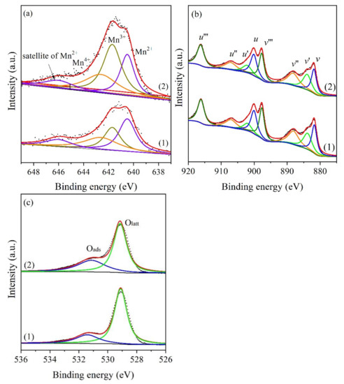 The formation of Ce3+ can also produce more oxygen vacancy and adsorbed oxygen species, which is confirmed by the XPS spectra of O 1s in Figure 3c. The peaks at 529.4 and 531.9 eV are characteristic of lattice oxygen (Olatt) and surface adsorbed oxygen (Oads), respectively [27]. The relative percentage of Oads was calculated by the peak area ratio of Oads/(Olatt + Oads). More adsorbed oxygen (33.1%) is detected on the surface of MnCe-H than on MnCe-L (22.3%), accompanied with a high ratio of Ce3+.