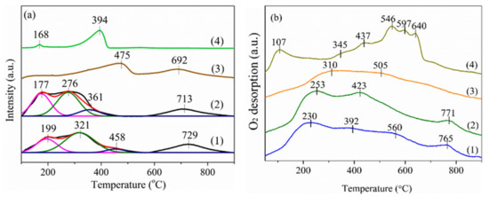 (a) H2-TPR and (b) O2-TPD profiles of (1) MnCe-L, (2) MnCe-H, (3) CeO2 and (4) Mn3O4.