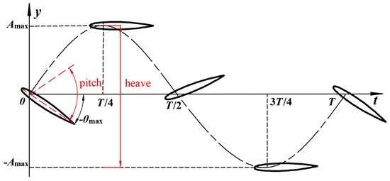 where represents the heaving amplitude of the flapping hydrofoil; represents the pitch amplitude of the flapping hydrofoil; T represents the period of motion. The basic motion equation of a flapping hydrofoil is defined by: