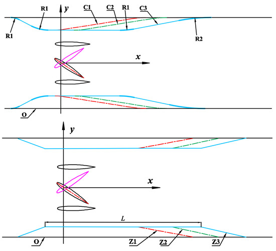 In Figure 3, the difference between the C-type passage and Z-type passage is that all parts of the C-type passage are connected by fillet transition, while the Z-type passage adopts right angle transition. The width of the O-type rectangular flow passage is 0.8 m, the unilateral indentation width of other flow passages is 0.1 m, the distance from the contraction inlet to the hydrofoil rotation center is 0.645 m, the length of the contraction flow passage at the inlet is 0.5 m, the length of the expansion flow passage at the outlet is 0.95 m, the radius of the fillet R1 is 1 m, and the radius of the fillet R2 is 2 m. The length L of the reduced flow passage at the center of each flow passage is different, as shown in Table 1.