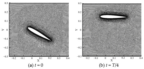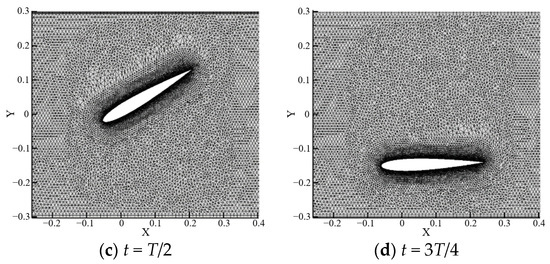 ANSYS FLUENT software was used for numerical calculations to conduct transient calculations. Dynamic mesh technology was used to solve the problem of hydrofoil motion, in which the elastic smoothing method and local reconstruction method were comprehensively used for the dynamic mesh model. For the elastic smoothing method, we set the elastic coefficient to 0.8 to reduce its impact on the grid in the far area and set the boundary point relaxation factor to 0.0006 to ensure that the grid node distribution at the boundary was not affected. For the local reconstruction method, we set the maximum mesh distortion ratio to 0.7 and the appropriate minimum mesh length standard to obtain the dynamic mesh at different times, as shown in Figure 4; the passage type is “o”, with width is 0.6 m, four main points represents the four moments of flapping hydrofoil, namely, upward attack—balanced position—downward attack—balanced position. The fluid medium in the calculation domain was set as water, the flow passage and airfoil surface were set as nonslip walls, and the interface between the three calculation domains was set as Interface. The differential equations governing the fluid flow were solved by setting the Coupled algorithm to couple the pressure field with the velocity field, and the second-order upwind scheme was used for discrete time. The step size should be less than the ratio of the minimum grid scale to the flow velocity, which should be adjusted according to the calculation under different conditions.