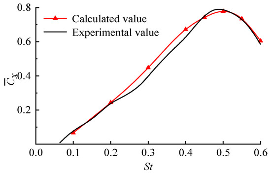 The NACA0012 airfoil was selected as the working part according to the literature [24]. The chord length of the airfoil is c = 0.1 m. The dimensionless dimensions of the calculation domain are set to be (20 c, 15 c). The rotation center of the flapping hydrofoil is set at 1/3 c from the leading edge. The distance between the rotation center of the flapping hydrofoil and the entrance boundary is 5 c. In addition, the inlet velocity m/s at the inlet boundary is set, the heaving amplitude of flapping hydrofoil Amax = 0.1 m, and the maximum angle of attack = 15°, the phase angle between deep motion and pitching motion , Reynolds number , and the amplitude of pitching motion of flapping hydrofoil are determined by the maximum angle of attack and Strouhal number St. At maximum angle of attack is the same. The simulation calculation was carried out for various working conditions with different Strouhal number St, and the numerical calculation results were compared with the experimental data in the literature [24]. The results are shown in Figure 5.
