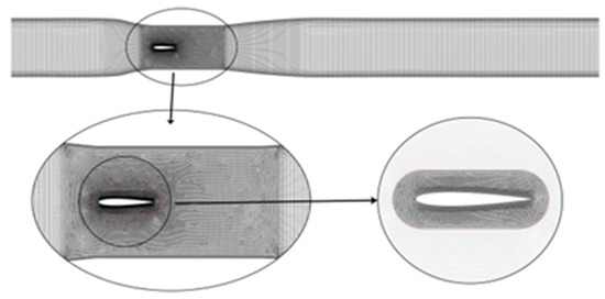 To study the influence of passage structure on flapping hydrofoil, it was necessary to fully develop the flow field through the hydrofoil flapping to reduce the influence of the wall surface on the simulation results. The length of the basin behind the flapping hydrofoil is 20 c, that is, the total length in the x direction is 8 m, and the length in the positive x direction is 6m. The initial rotation center of the flapping hydrofoil is located at the origin. In addition, to save computing costs, the computing domain was divided into unstructured grid regions centered at the origin and 1m long in the x direction, and the hydrofoil movement was realized with the help of dynamic grid technology. In addition, to better capture the flow field of the airfoil and the wall, the boundary layer was divided around it, and the thickness of the first layer grid was 0.0015 m (y +> 37.5). The boundary layer of the airfoil and its several outer layers of grids were separately divided into a fixed region, which does not participate in grid reconstruction when the hydrofoil moves, to ensure the grid quality around the airfoil. The rest areas were divided by a structured grid. The computational domain and grid division without pitch angle at the initial time is shown in Figure 6.