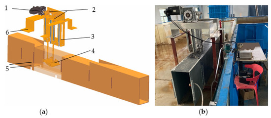 (a) Schematic diagram of flapping hydrofoil water pushing device test bench: 1. Motor and reducer; 2. Double crank mechanism; 3. Slide rail; 4. Flapping wing; 5. Contraction and expansion passage; 6. Support frame (b) Photograph of the flapping hydrofoil water-pushing device test bench.
