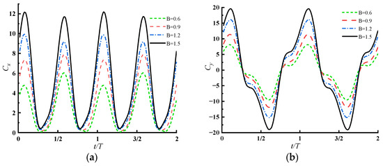 The hydrodynamic performance of the water-pushing device is affected by the passage width, which is reflected in the instantaneous thrust and lift coefficient of the flapping wing. As shown in Figure 8, four typical groups are selected for comparative analysis.