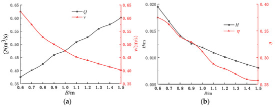 Comparison of hydrodynamic performance of different passage widths: (a) Width-flow and velocity curve comparison; (b) Width-head and efficiency curve comparison.