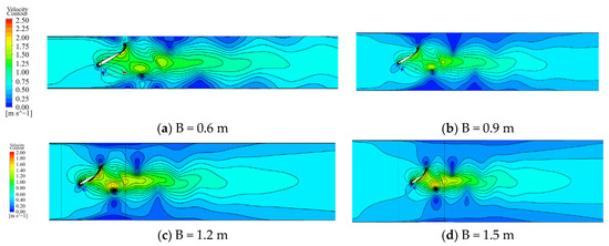 The passage width has a great impact on the pumping performance of the flapping wing hydrodynamic device. With the increase of passage width, the average flow of the device increases steadily while the average head decreases, which can better adapt to the water conveyance requirements of low head and large flow in plain rivers. To further analyze the reasons for the influence of passage width on the pumping performance of flapping hydrofoil, four groups of simulation results with passage widths of 0.6 m, 0.9 m, 1.2 m, and 1.5 m were selected to draw the velocity and vorticity nephogram of flapping hydrofoil under different passage widths, as shown in Figure 10 and Figure 11.