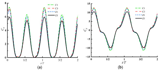 Variation of instantaneous thrust and lift coefficients with different passage structures: (a) Instantaneous thrust coefficients; (b) Instantaneous lift coefficients.