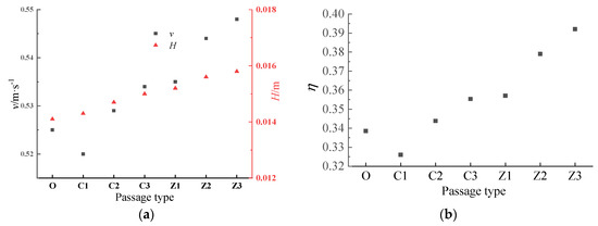 Comparison of hydrodynamic performance of different passage structures: (a) Type-velocity and head curve comparison; (b) Type-efficiency curve comparison.