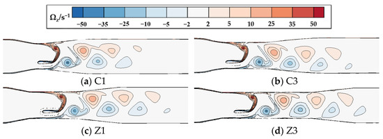 Select the component Ωz of vorticity in z direction as the characteristic quantity, and then draw the vorticity contour map under various working conditions. The calculation formula of the vorticity component in the z direction [26] is: