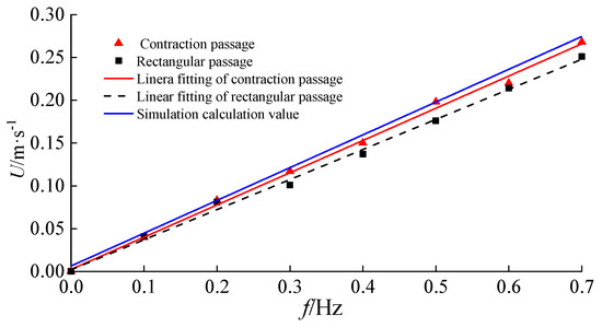 Compare the test flow rate with the simulation results, as shown in Figure 15. When the frequency is 0.7Hz, the experimental flow rate is 0.252 m/s. The overall trend of the experimental and simulation results is the same. The flow rate of the device increases with the increase of the motion frequency. Compared with the rectangular passage, the contraction passage can effectively improve the flow rate of the water-pushing device. However, the simulation result is slightly higher than the test result, and the main reason for this difference is that there are inevitably some gaps at the joint of the test flow passage, which leads to the leakage of some pressurized water bodies during the test process, indirectly losing some energy; there is also a certain distance between the flapping blade and the flow passage, leading to the generation of three-dimensional effect, which has a certain impact on the test results.
