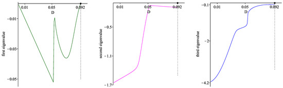 The eigenvalues of the interior equilibrium are determined numerically, using the already computed values of the equilibrium components on the mesh . Figure 3 visualizes the three eigenvalues of with respect to D. It is seen, that the three eigenvalues of are negative for , thus the interior equilibrium is locally asymptotically stable. At the first eigenvalue approaches zero, so undergoes a local bifurcation. In fact, and coalesce at and exchange stability, thus a transcritical bifurcation occurs at this value of D.