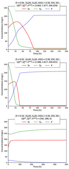 In our study we assume that the influent concentrations of phenol () and SA () are constant. The dilution rate D is considered as a control function in the model.
