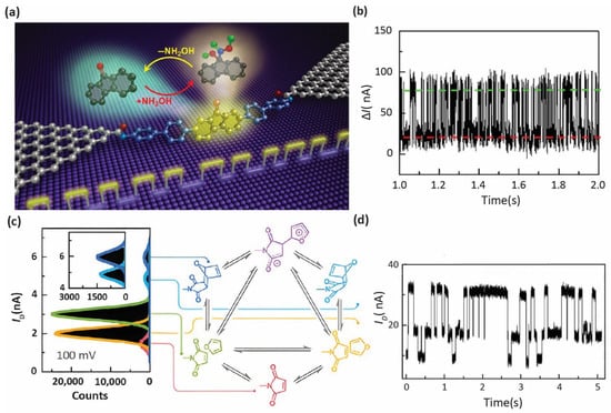 Recently, Yang et al. took advantage of the high stability and temporal resolution of the GMG junction to unveil an unprecedented time trajectory of the Diels–Alder reaction under a high electric field []. They used electric current signals to distinguish five different zwitterionic intermediate states and their time scales (Figure 3c,d). The Diels–Alder reaction is considered “concerted” (all bond formations and breaking are mechanistic but in a single step); therefore, the time scale of the intermediate states is faster than the response of many conventional spectroscopy techniques. They also reacted maleimide with furan while changing the orientation of the external electric field and observed that orienting the electric field along the line connecting the partial charge delayed the transition structure. Jia et al. designed a reversible photo-switch by covalently trapping a single molecule of light-sensitive diarylethene in the nano-space of two graphene electrodes []. The original form of the molecule is insulating and denoted as being open form. In the GMG junction, they varied the wavelength of light to excite electrons in the molecule, which induced reversible switching of the current signals with a high on/off ratio.