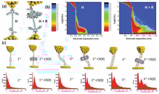 In 1987, the Nobel prize in chemistry was awarded to Donald J. Cram, Jean-Marie Lehn, and Charles J. Pedersen for their landmark achievement in the development of a structure-specific assembly of molecules motivated by noncovalent interactions of defined selectivity called the “Host–Guest” systems [,]. Since then, research into the host–guest systems has become increasingly popular among chemists, physicists, advanced material scientists, and biologists as applied to drug delivery, nanomedicine, molecular electronics, sensors and actuators, catalysis, functional materials, and so on [,,,,]. Simple and complex supramolecular structures can be assembled when a “host” (macrocycles) molecule accommodates another “guest” molecule through any form of noncovalent interactions like π-π interaction, van der Waals interaction, electrostatic interactions, hydrophobic/hydrophilic interactions, and hydrogen bonding []. It has been shown that the robust SMJ techniques can also account for weak noncovalent interactions between the host and guest molecules []. For example, Milan et al. formed a host–guest complex in an STMBJ setup by rotaxinating an unstable archetypical insulating hexayne with a macrocycle (Figure 4a) []. They attached a 3,5-diphenylpyridine on either side of the hexayne molecular wire to serve as a stopper for the mobile macrocycle and an anchor for the Au electrodes. The molecular conductance of both the molecular wire and the host–guest assembly revealed that the mobile macrocycle does not significantly affect the conductance profile of the hexayne molecule (Figure 4b). To further establish the sensitivity (extreme limit of detection), Yuan et al. compared and reported the kinetics of a dimerization reaction of a cucurbit [] molecule hosting a 1,2-bis(4-pyridinyl)ethylene guest using an in situ STMBJ and nuclear magnetic resonance (NMR) []. In NMR, the characteristic peaks of the reactants are not noticeable because of the small reactant concentrations; however, clear and defined electrical signals are noticeable and detected in STMBJ for reactant concentrations that are as low as 5 × 10−6 M. They also reported that a strong electric field in the nanogap increased the efficiency of host–guest formation. Zhang et al. also used cucurbit[8]uril as a host molecule to recreate the environment of different conformations of viologen (bipyridinium) guest molecules as shown in Figure 4c []. They recorded the conductance profile of each viologen conformation with their corresponding viologen guest. Their results show a significant increase in conductance when a cucurbit[8] molecule hosts the viologen guest molecule (Figure 4c).