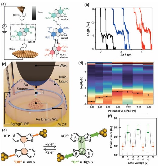 Several open and closed shell redox-active moieties, including benzodifuran [], diazonium [], metalloproteins [,,], coronene [], bipyridinium [,], anthraquinones [], Cucurbit[n]uril [], polyoxometalate [], viologen [], perylene tetracarboxylic acid [,,], ferrocene [], etc., have been studied at the single-molecule level by sweeping potentials in an electrochemical cell. For instance, Li et al. tuned the charge transport of a redox-active single-molecule naphthalenediimide (ND) pendant flanked by a dihydrobenzothiophene anchor using an electrochemical STMBJ (Figure 5a) []. They took advantage of the wide potential window of the ionic liquid in the electrochemical cell to access three reversible distinct charge states with well-defined conductance plateaus (Figure 5b). During a potential sweep, they observed that the neutral state of ND showed a conductance 10−4 G0 at −0.20 V which changed to 10−3.3 G0 at −1.50 V upon reduction to the first anionic radical (ND1−) state. At −1.50 V, the conductance also increased to 10−3.0 G0 as a result of further reduction to the second anionic (ND2-) state. In another experiment, Chen et al. added a positively charged electrostatic anchor formed from the Coulombic interaction between Au electrodes and positively charged pyridinium terminals to the existing anchor bank []. In their work, they also demonstrated redox switching sponsored by charge injection in neutral 4,4′-bipyridine (BIP), radical cationic bipyridine-methyl viologen (BIP-Me•+), and dicationic BIP-Me2+. The conductance measurement in the three species shows two (low and high) distinct conductance plateaus. The low and high conductance states in the neutral state were attributed to the change in the contact geometry of the single-molecule junction during tip retraction. However, there is a significant increase in the bimodal conductance states of BIP-Me•+ and dicationic BIP-Me2+ traceable to the key role of the anchor group in electron injection and extraction. Recently, Naghibi et al. successfully incorporated single-molecule persistent 6-oxo-verdazyl radicals between the source and drain electrodes of STMBJ containing an electrochemical cell using a thioanisole anchor (Figure 5c) []. Prior cyclic voltammetry measurement showed that a reversible one-electron oxidation of the open shell structure of 6-oxo-verdazyl to a monocation at +0.36 V and a one-electron reduction to a monoanion at −1.03 V. To access the potential window of the redox molecule, electrochemical measurements were done in 1-butyl-3-methylimidazolium triflate ionic liquid. Between a −0.2 V to −0.8 V vs. Fc/Fc+ gate potential, a slight gating effect was observed with a small and slow stepwise conductance increase (Figure 5d). At −1 V vs. Fc/Fc+ (near the reduction potential of the open shell structure), a sudden and abrupt drop in conductance by almost one order of magnitude occurs and continues to decrease as the potential is further reduced. The result of their work highlighted the possibility of using an electrochemical cell to stabilize persistent radicals and further establish a fascinating route to incorporating open shell structures into molecular electronics. Yin et al. used an electrochemical cell to activate a redox reaction in [8,8′biindino]thiophenylidene (BTP) molecular wire (Figure 5e) []. At a positive gate potential, they recorded low values of conductance that depict that the charge transport is dominated by the highest occupied molecular orbital. At a negative potential bias, they observed a slight surge in the conductance until −1.4 V. At a negative bias below −1.4 V and a positive bias above 1 V, a significant and reversible switch in conductance was observed, which corresponds to the reversible oxidation and reduction of the BTP molecular center (Figure 5f). They cleverly leveraged Hückel’s theory of antiaromaticity to show conductance switching in a redox active molecule. Clearly, the development of electrochemical break junction techniques is key to addressing reactions involving redox-active molecules at the single-molecule level, and helps to create an ideal environment to stabilize and test anions, cations, and radicals that are otherwise unstable.