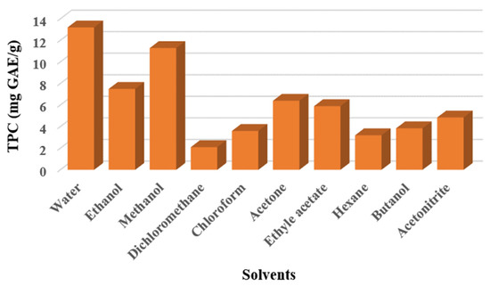 Ten solvents were tested to select the most appropriate in maximizing the extractable efficacy on TPC. The results obtained when quantifying phenolic content in terms of used solvents are presented in Figure 2.