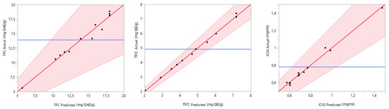 The quality of the studied model was confirmed by the coefficient of determination (R2). The latter was equal to 0.97, 0.99 and 0.98 for TPC, TFC and DPPHIC50, respectively. The R2 adjusted and predicted are also sufficient to testify the prediction quality of the chosen models. Notably, an excellent correlation was observed between the experimental and predicted results. The graph in Figure 3 confirms this good agreement by showing a linear curve for the actual values in terms of the predicted ones.