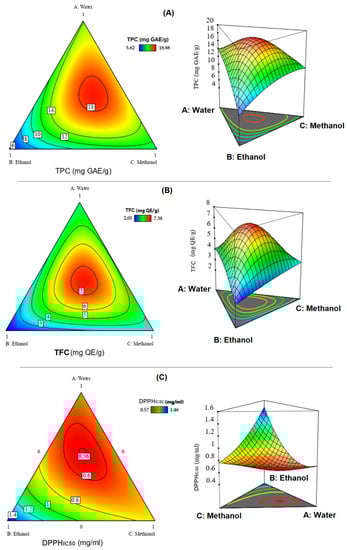 The simplex-centroid design, with different combinations of the solvents and the recorded response of each experiment on TPC, TFC and DPPHIC50, are listed in Table 2. The experiments were conducted after randomization and every response averages three replicates.