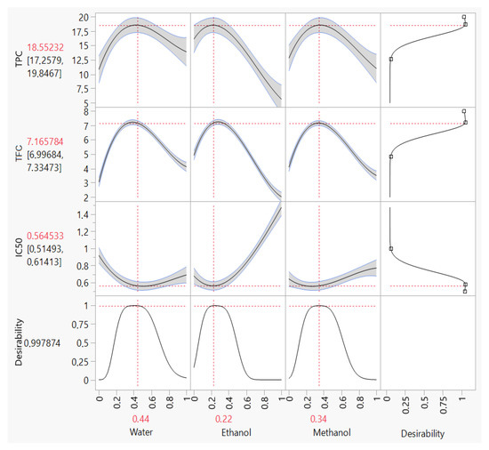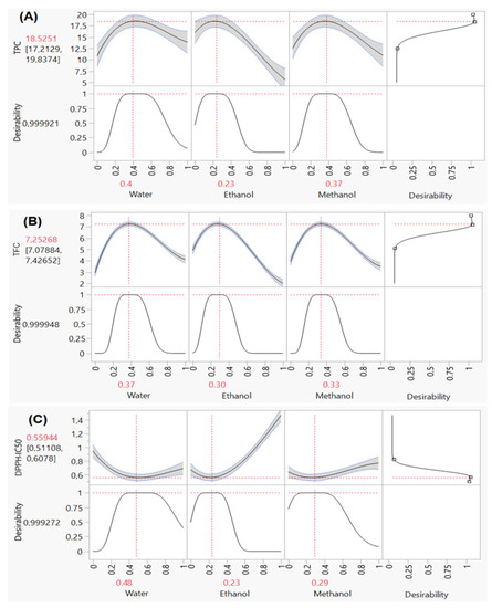 The TPC of 12 different extracts of the samples ranged from 5.62 to 18.86 mg GAE/g (Table 2). The illustrations in the contour and surface plots (Figure 4A) show that a mixture of water, methanol and ethanol is needed to reach a value of around 18 mg GAE/g. Furthermore, the desirability plot (Figure 5A) shows that the maximum value of the TPC that can be achieved is equal to 18.5 mg GAE/g. This value is possible with a desirability of 99% by ensuring the following operating conditions (40:23:37 v/v/v) water:ethanol:methanol.