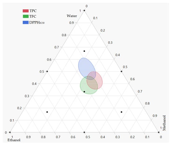 Depending on the priority of the responses under study, the simultaneous optimization of all responses using the desirability function could provide various solutions. In our case, the response DPPHIC50 was the most important. Thus, simultaneous optimization involves finding the best compromise to improve all responses with the priority of the DPPHIC50 response. According to the desirability plot (Figure 6), the maximum responses for TPC, TFC and antioxidant activities by DPPH assays were obtained by the ternary solvents mixture (44:22:34 v/v/v) water:methanol:ethanol. With this solvent system, we can obtain a value of 18.55 mg GAE/g, 7.16 mg QE/g and 0.56 mg/mL for TPC, TFC and DPPHIC50, respectively. The mixture contour plot of all the responses, created by the three solvents water, methanol and ethanol (Figure 7), makes the effects of the simultaneous optimization more obvious. The position of these three responses in the combined mixture plot suggests a possible correlation between them. Indeed, it has been previously demonstrated that a statistical correlation exists between the amount of total phenol and flavonoid content and the antioxidant activity [49]. In this way, a correlation test was performed to check this hypothesis. As a result, and since the plant extracts with higher levels of total phenolics exhibit low values of DPPHIC50, a significant negative correlation was observed for the correlation between DPPHIC50 with TPC (r = −0.89; p-value = 0.0001) and TFC(r = −0.78; p-value = 0.028).