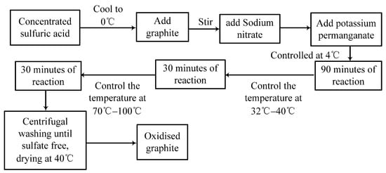The preparation of the catalyst needs three stages, namely the preparation of graphene oxide (GO), Fe3O4@rGO and Fe3O4@B-rGO.The first is the preparation of graphene oxide (GO), and the modified Hummers method is used to prepare GO, its specific preparation process is shown in Figure 1.