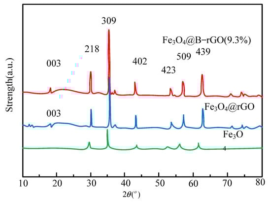XRD patterns of Fe3O4@B-rGO (9.3%), Fe3O4@rGO and Fe3O4.